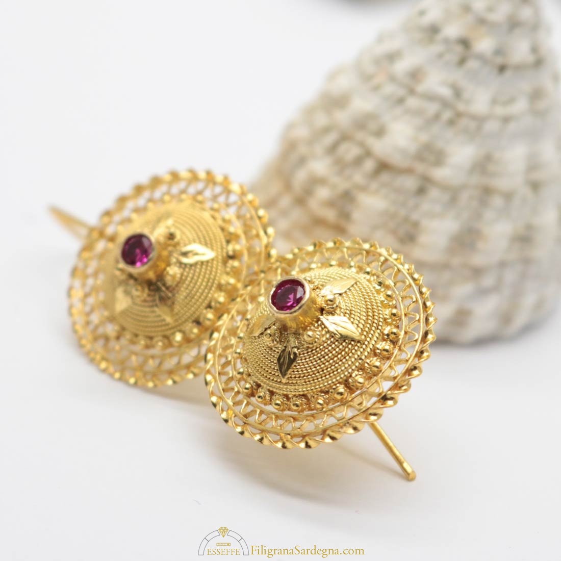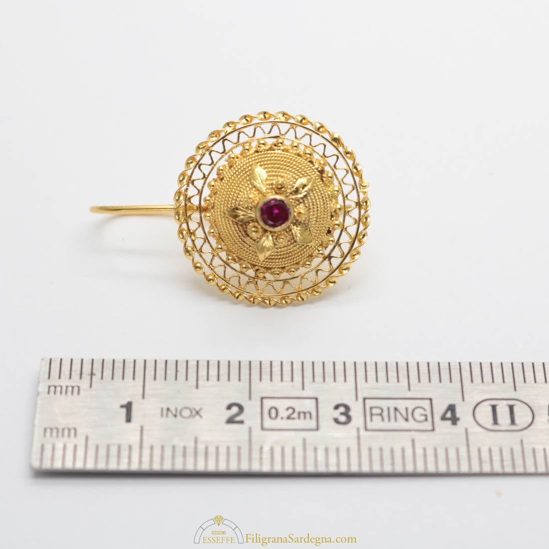 Categoria: orecchini in filigrana a monachella Lega: oro 750 Peso: 2,6 gr Lavorazione: filigrana, granulazione Diametro bottone: 1,o cm Pietre: rubino