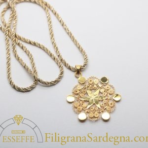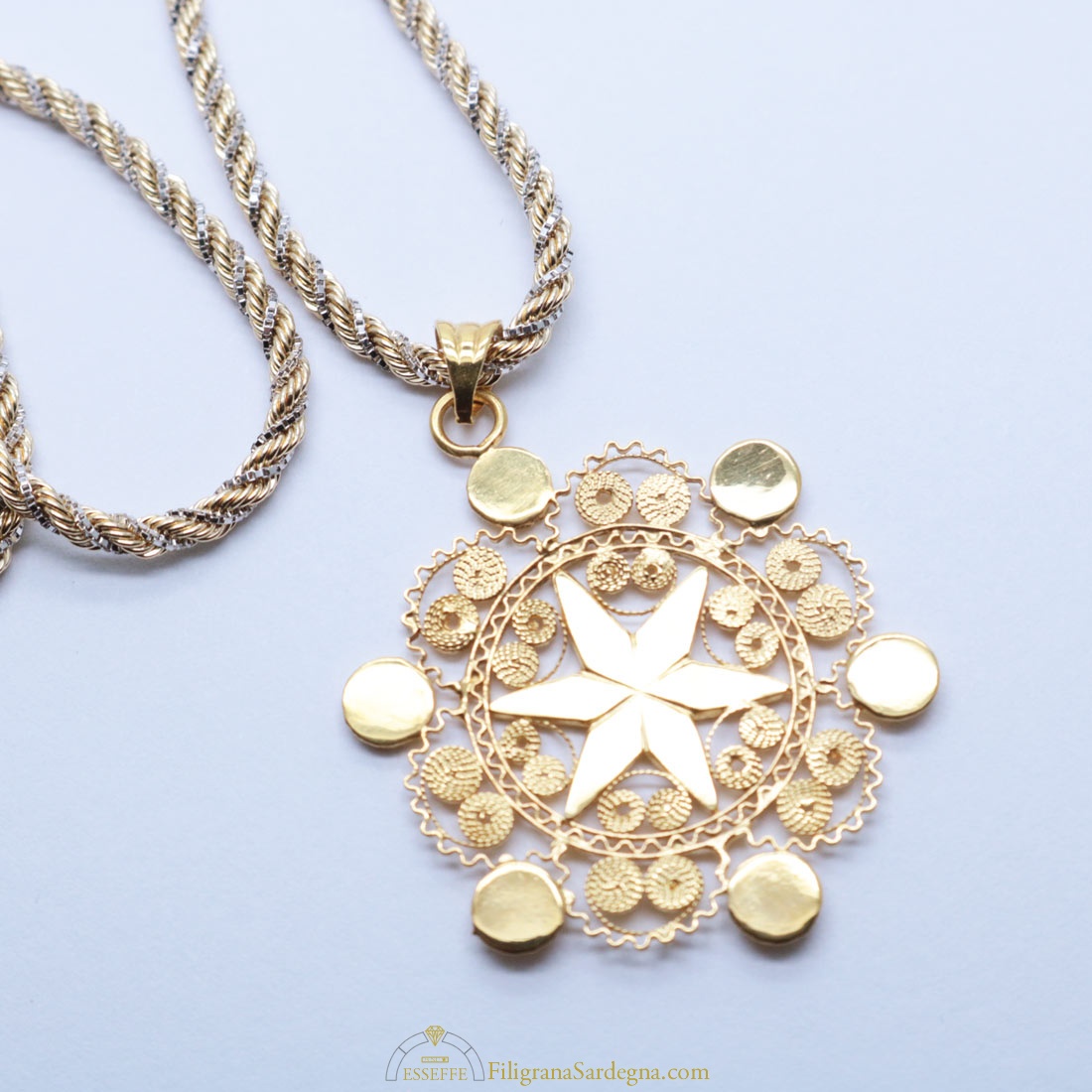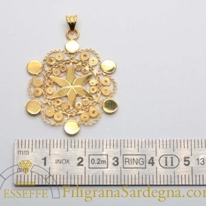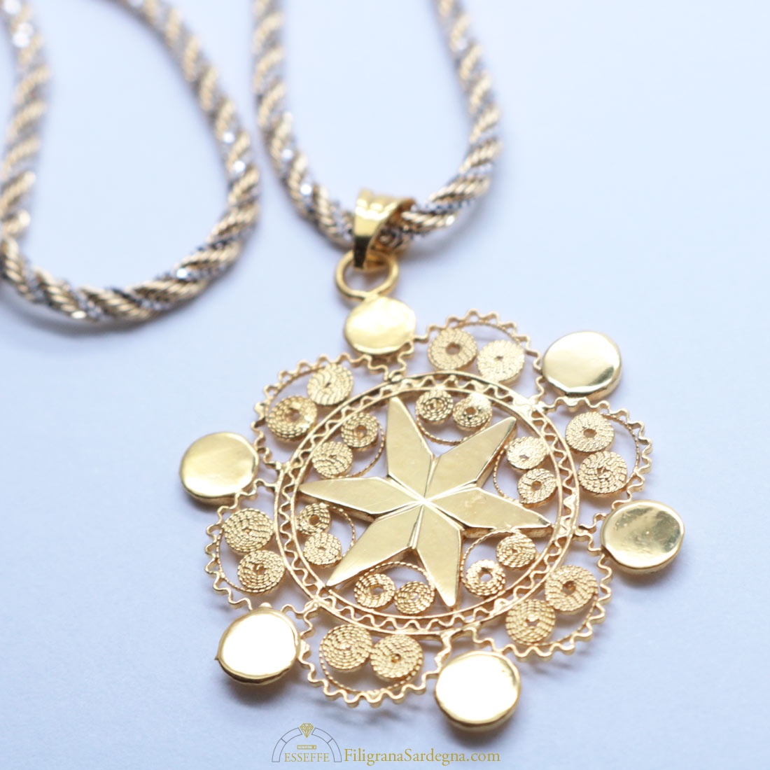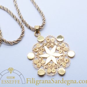 Ciondolo in filigrana e lastra d’oro il cui disegno è quello della parte a fiore della spilla del costume tradizionale sardo dorgalese. In questo modello il decoro in filigrana si accosta agli ancoli interni della stella  oltre che ai lustrini tondi.