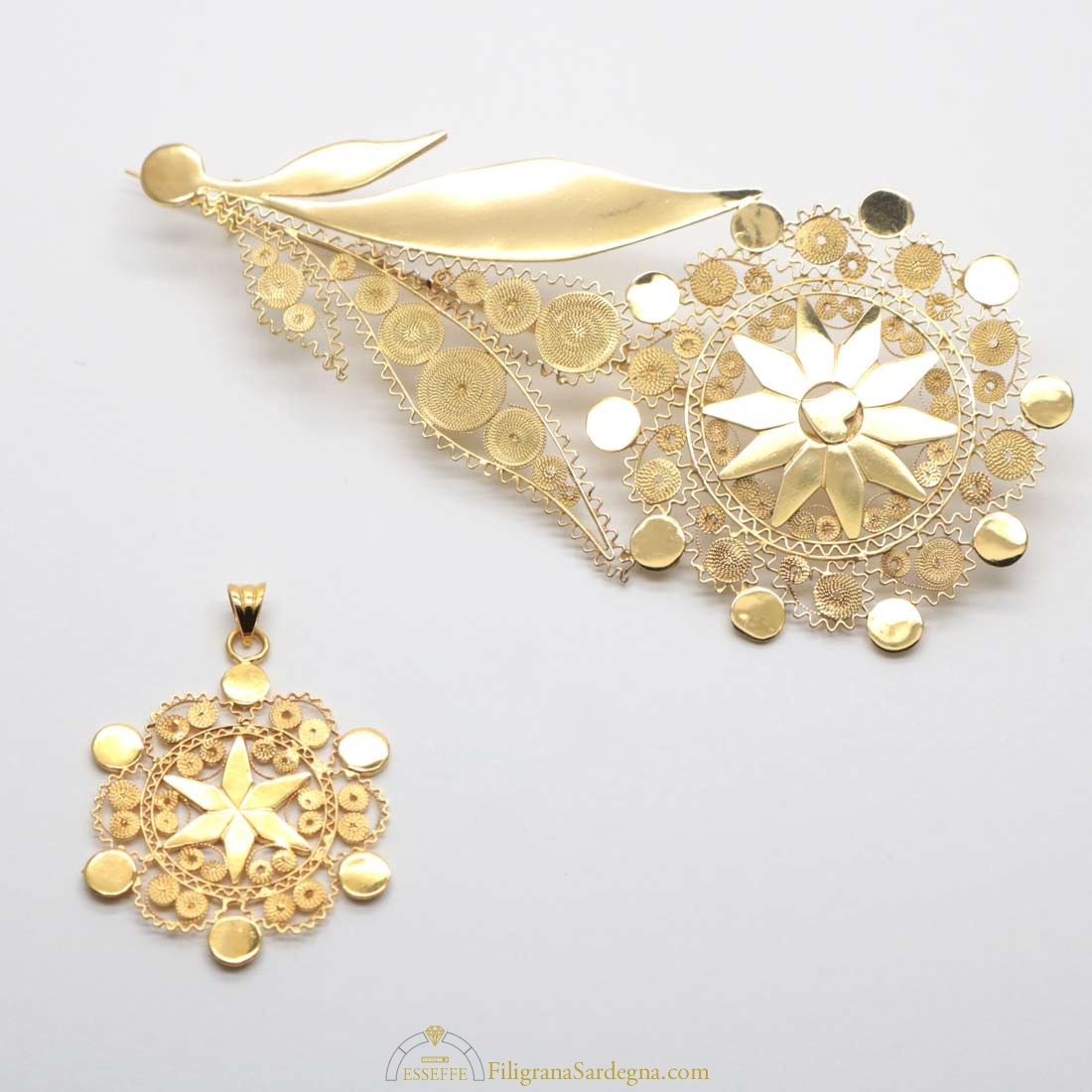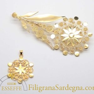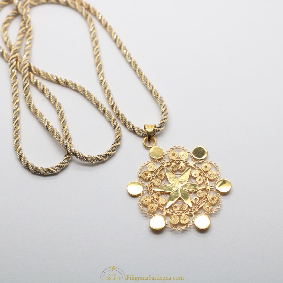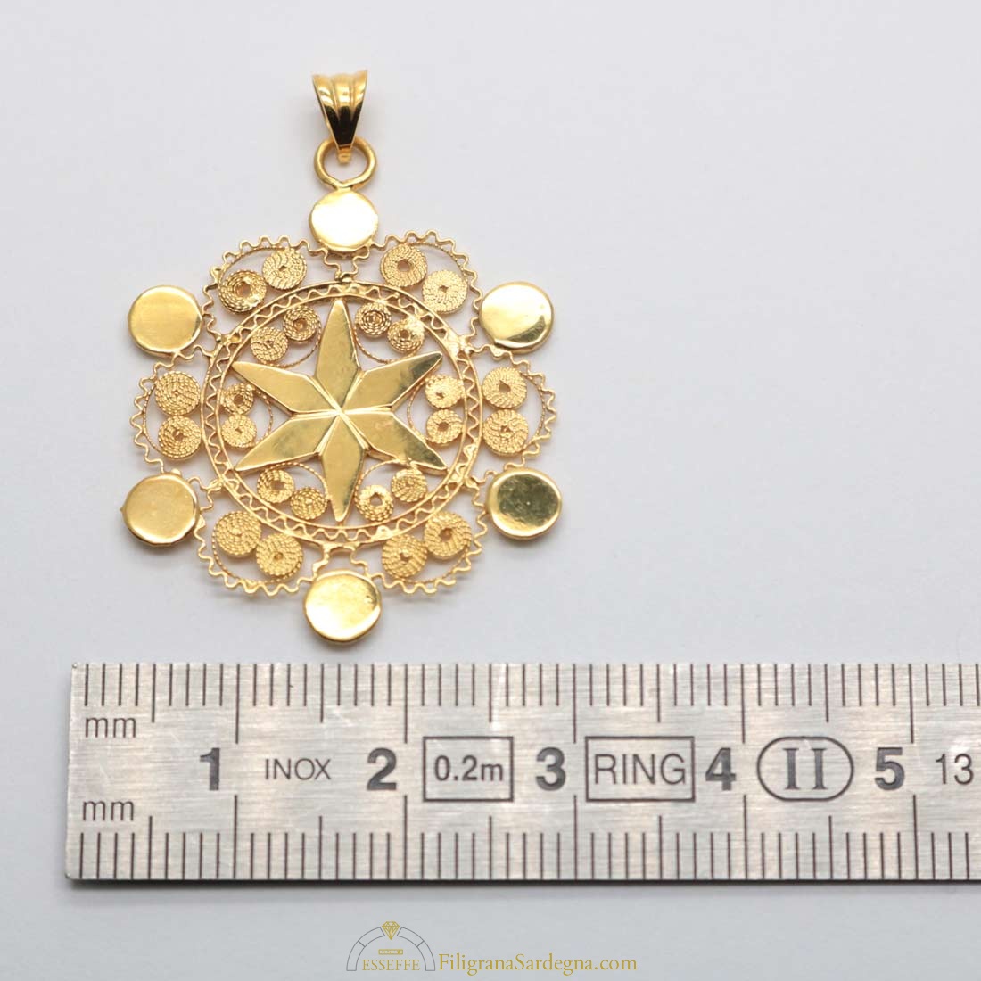 Ciondolo in filigrana e lastra d’oro il cui disegno è quello della parte a fiore della spilla del costume tradizionale sardo dorgalese. In questo modello il decoro in filigrana si accosta agli ancoli interni della stella  oltre che ai lustrini tondi.