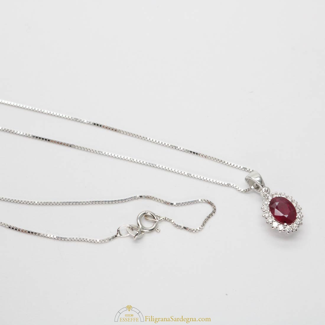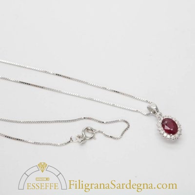 Ciondolo in oro bianco con rubino contornato da diamanti e catenina classica modello veneziana.