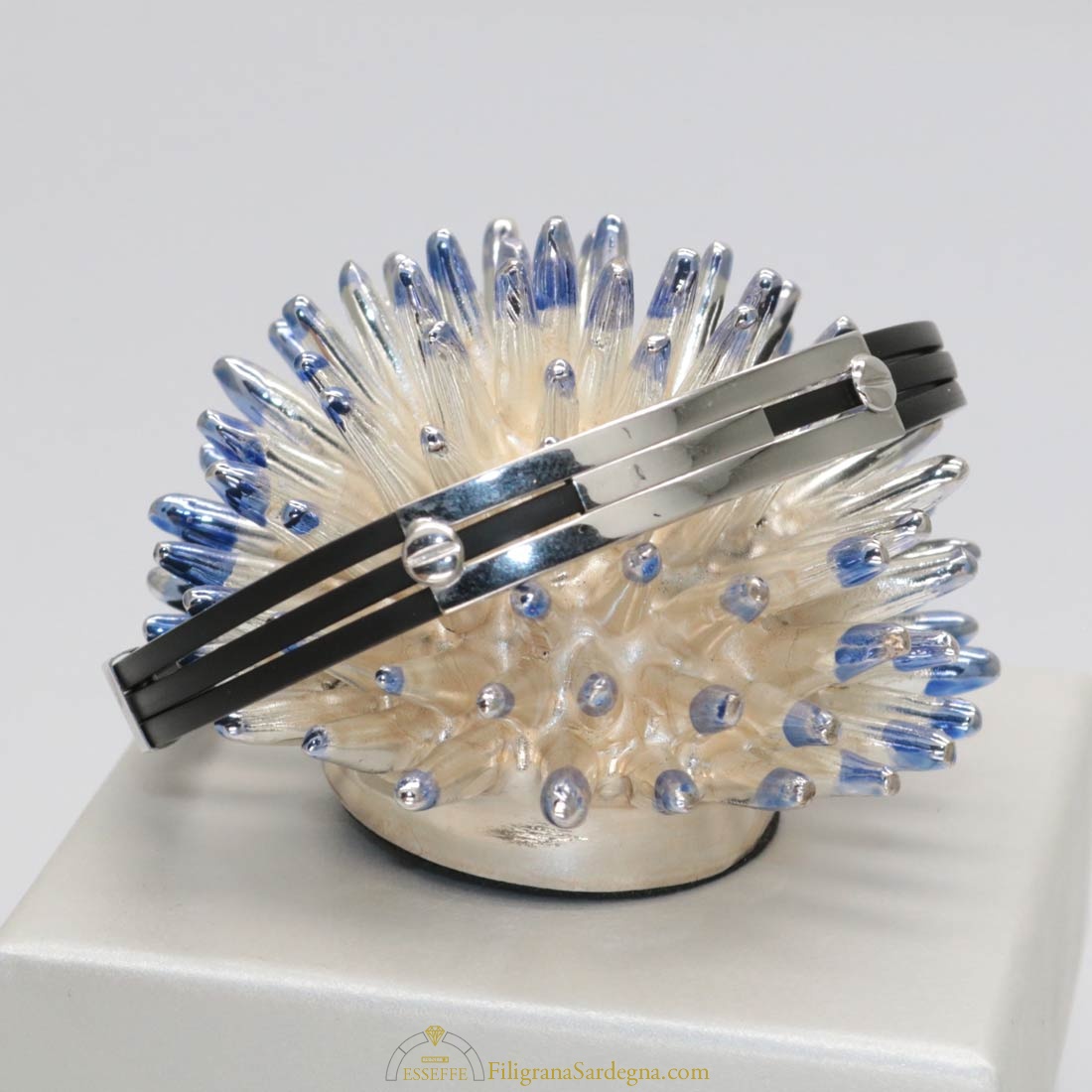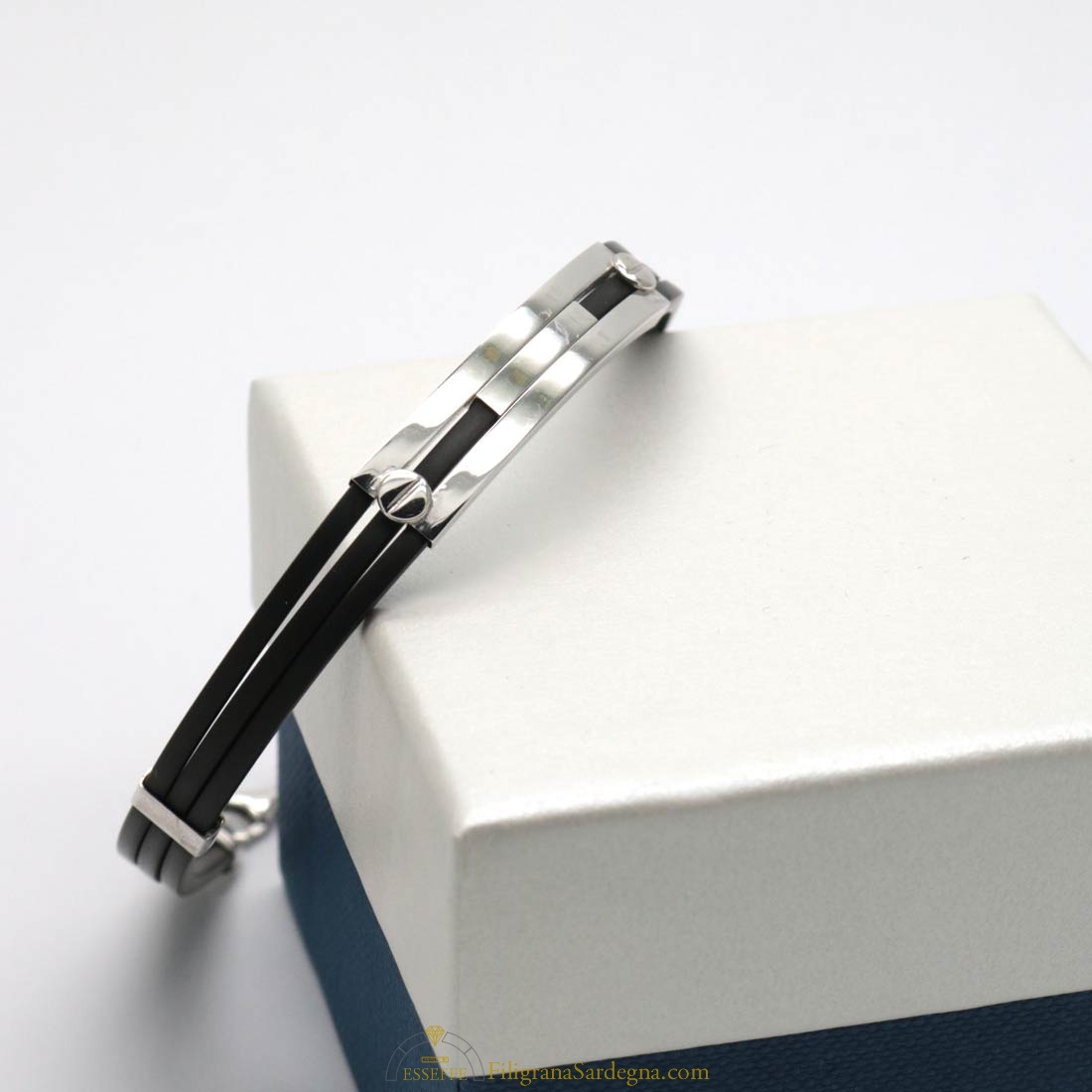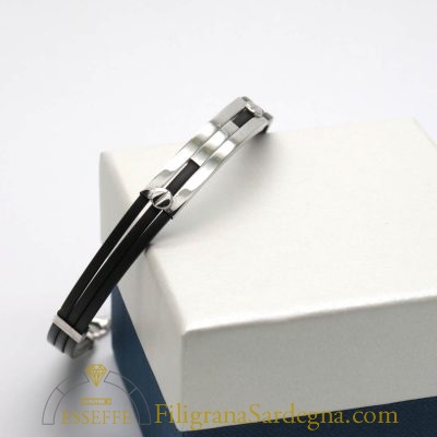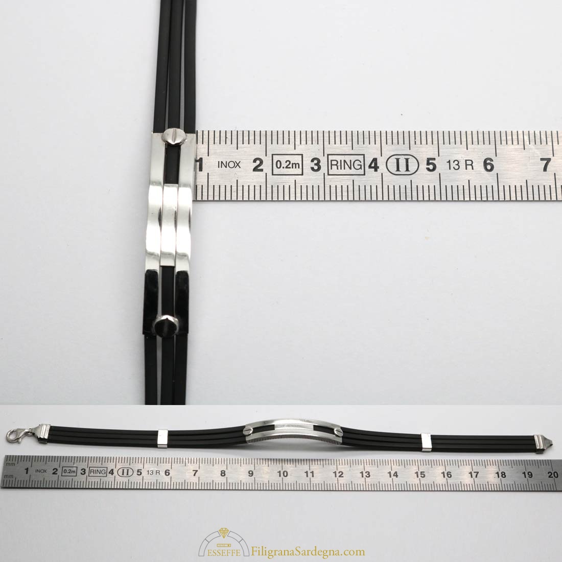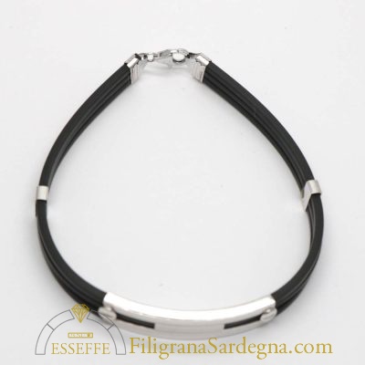 Bracciale in caucciù con elemento a piastra rigido in oro bianco lucido e placchette, terminali e moschettone in oro bianco.