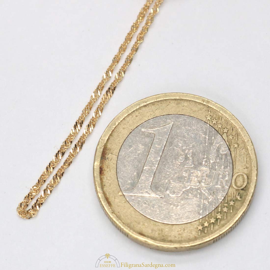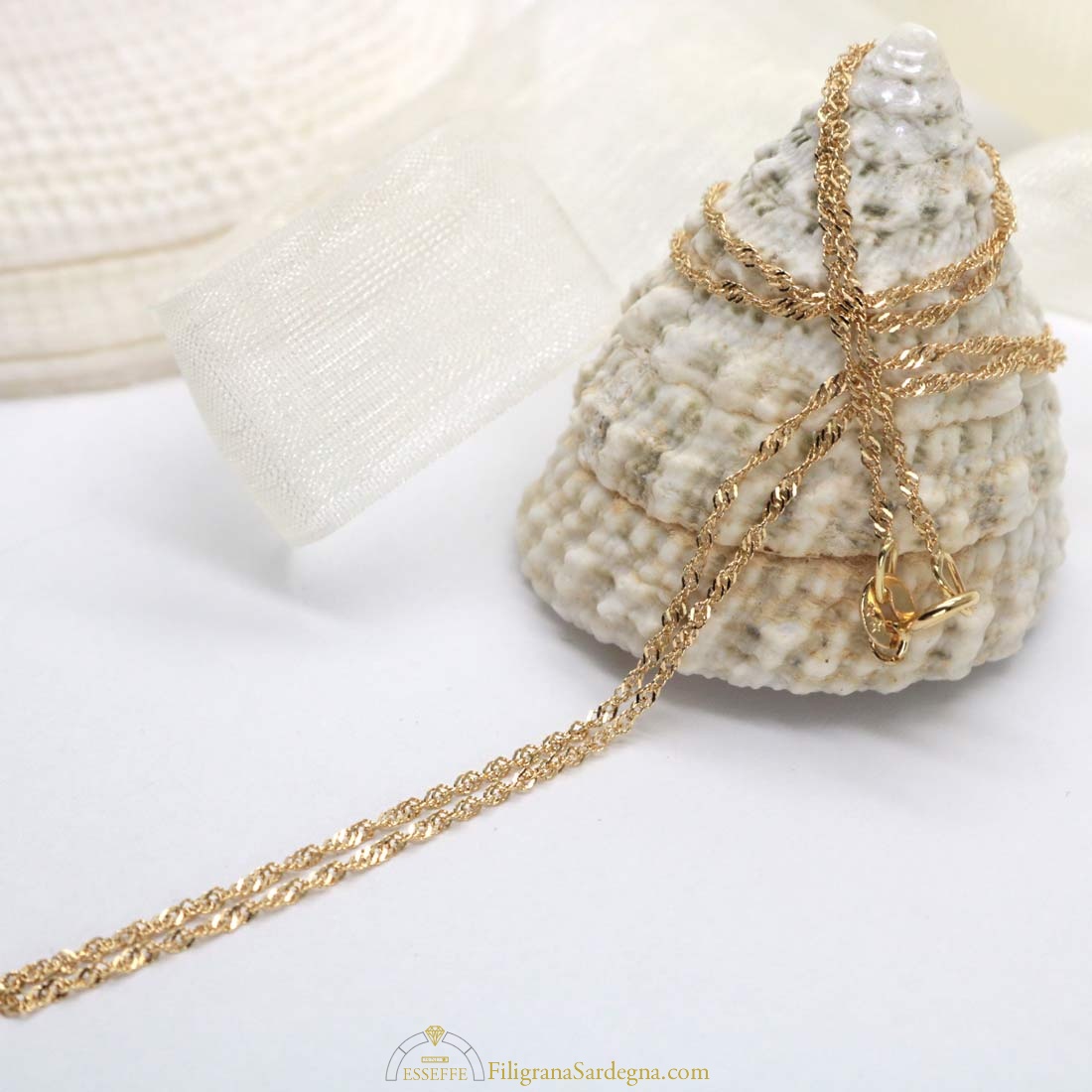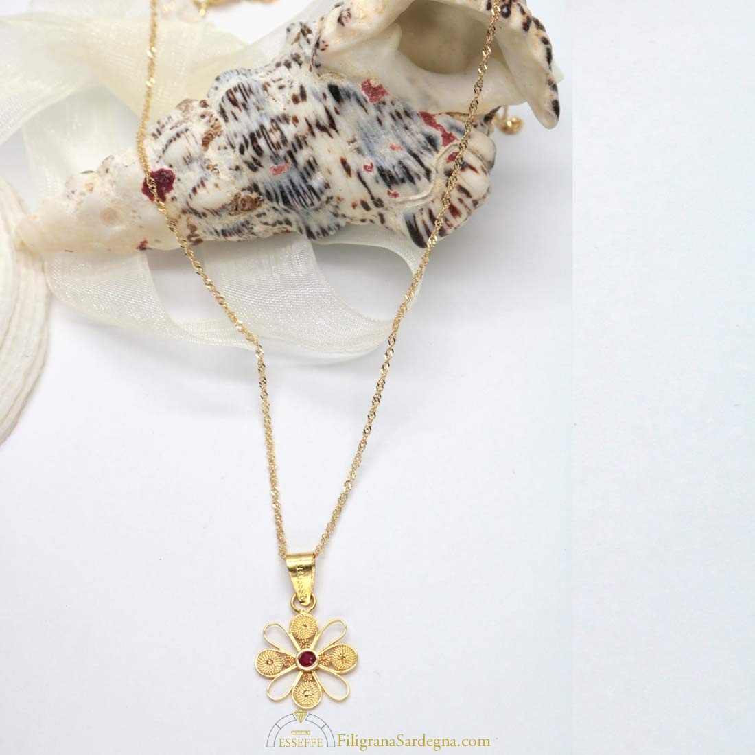 Collana girocollo in oro giallo 18 Kt modello Singapore, adatta all’abbinamento con ciondoli leggeri in filigrana d’oro, come il Fiore a petali alternati con rubino, in foto con la collana.