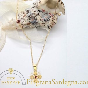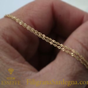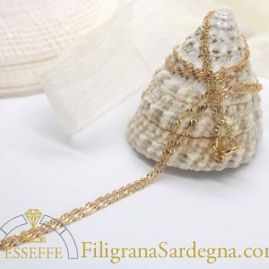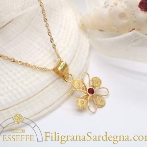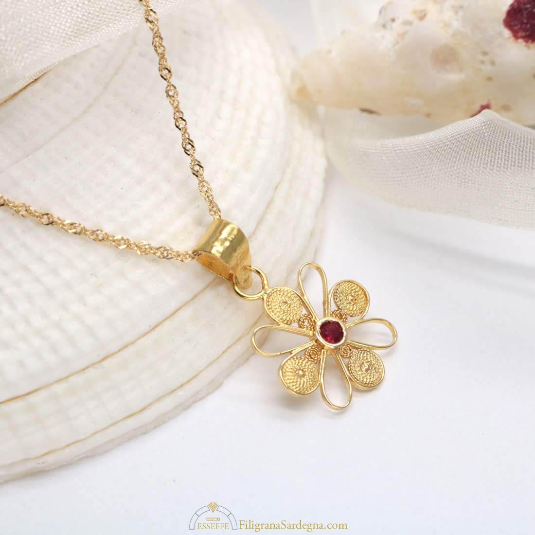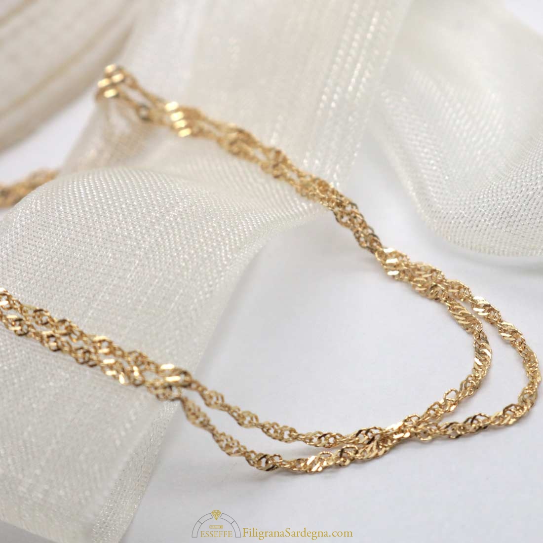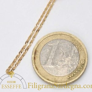 Collana girocollo in oro giallo 18 Kt modello Singapore, adatta all’abbinamento con ciondoli leggeri in filigrana d’oro, come il Fiore a petali alternati con rubino, in foto con la collana.