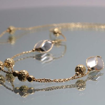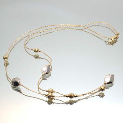 Bellissima collana in oro giallo con intercalari a sfera con superficie a motivo geometrico ed elementi in oro bianco a supefice lucida, doppio pendente con con la medesima lavorazione.