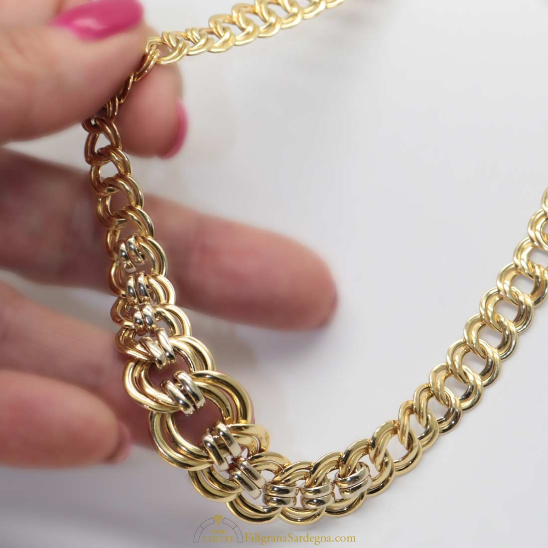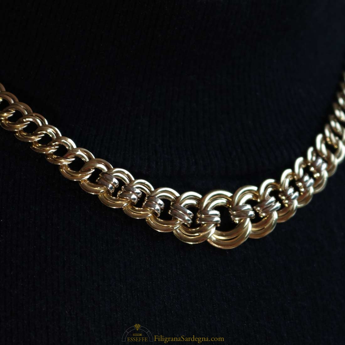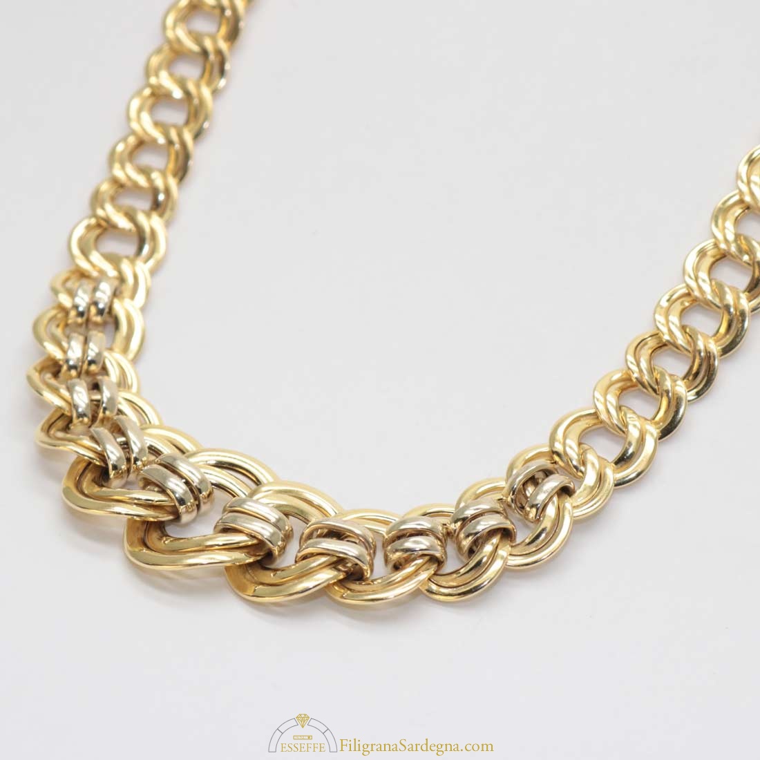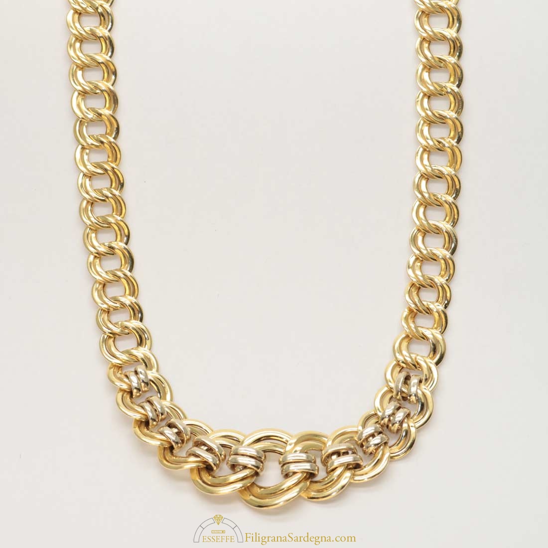 Bellissimo collier in oro giallo e bianco con maglie a scalare.