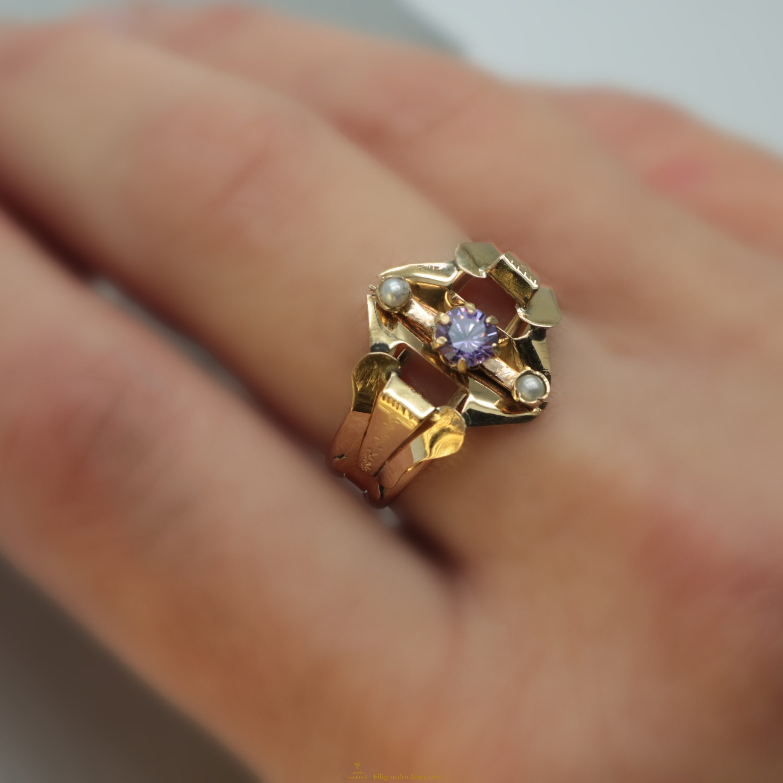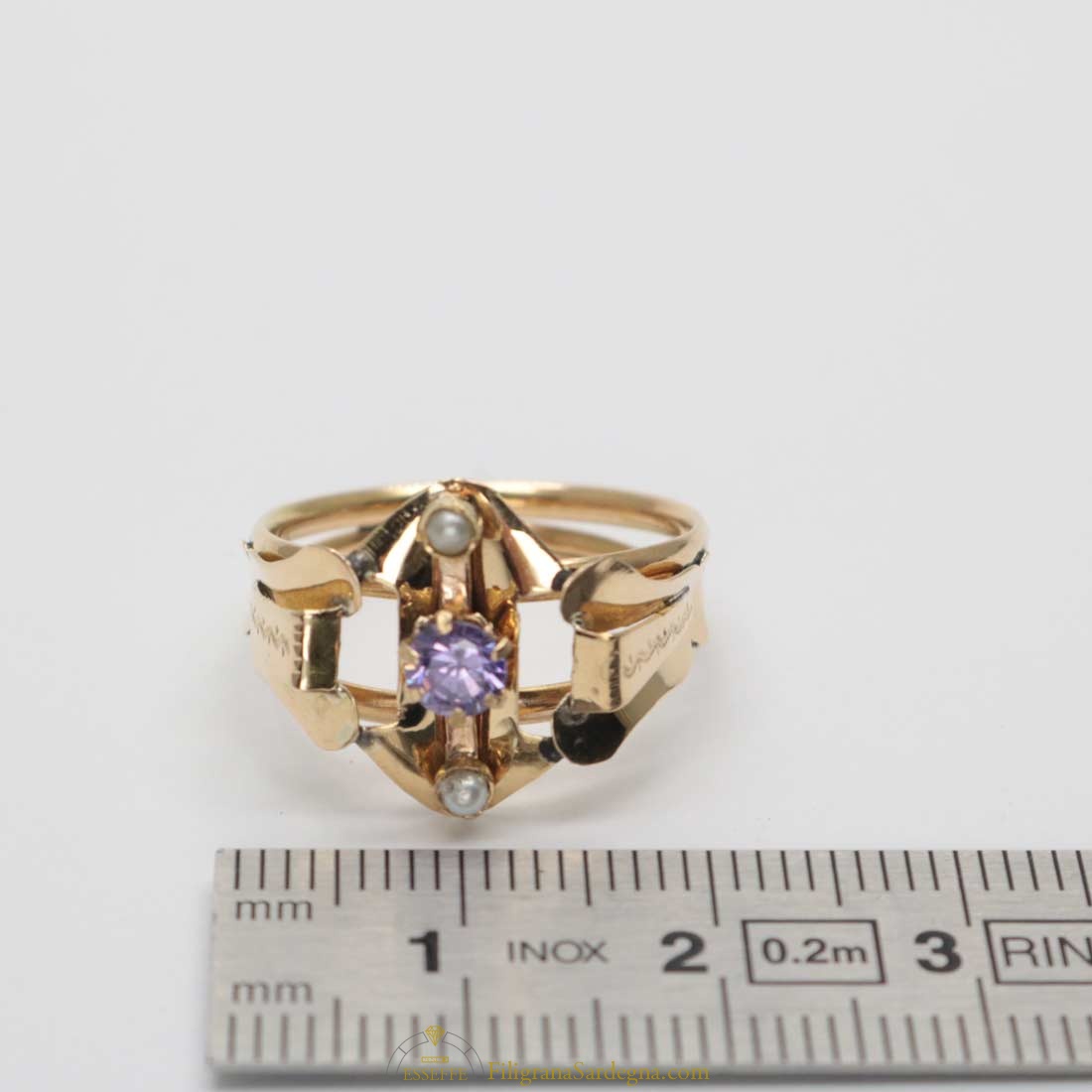 Anello in oro giallo con decori a bulino sugli elementi laterali al modulo centrale su cui è incastonata una pietra lilla e due piccole perline.