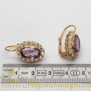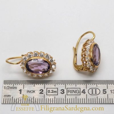 Orecchini pendenti a monachella con bellissime ametiste naturali contornate da zirconi bianchi.